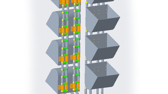 | 2 Elevating system Plate chain elevator, whose chain is not easy to stretch and is stable and reliable in use. Deceleration motor direct drive with anti reverse device. The elevator chute is equipped with a wear-resistant plate structure to improve wear resistance. |